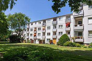 Unsere Wohnungen verteilen sich auf fünf Gebäude mit vier bis fünf Geschossen, die ebenerdig durch Laubengänge verbunden sind.