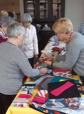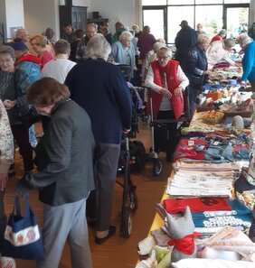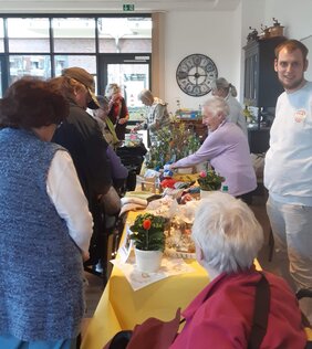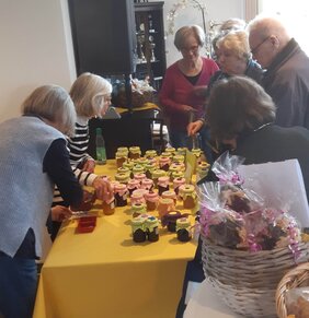 Kurz vor dem Osterfest stand für die Mieter*innen des Wilhelm Leuschner Seniorenzentrums und der Georg und Emma Poensgen-Stiftung der Frühlingsbasar auf dem Programm: Farbenfrohe Pflanzkörbe, Deko aller Art, Grußkarten, leckere Kekse sowie Mandelhörnchen, Marmeladen in diversen Geschmacksrichtungen und liebevoll gefertigte Handarbeiten aller Art waren im Angebot. Die Einkaufstaschen füllten sich schnell! Im Anschluss gab es zur Stärkung Kaffee und Kuchen beim Minimarkt Berger.