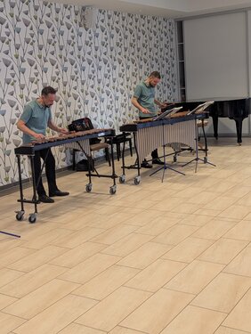 Am Donnerstag, den 20.03.2026 wurden große Geschütze aufgebaut. Das Mallet Duo hat den Mieter*innen des Wilhelm-Leuschner-Seniorenzentrums und der Georg und Emma Poensgen-Stiftung mit einem riesigen Xylophon und der Marimba den Nachmittag verschönert. Klassische Musikstücke von Johann Sebastian Bach, Antonio Vivaldi und weiteren Komponisten wurden von dem Duo auf diesen einzigartigen Musikinstrumenten gespielt. Es wurde geklatscht, geschwenkt und die Bewohner*innen haben viel über die Geschichte der Instrumente kennengelernt. Für die kleine Stärkung gab es noch Kaffee und Kuchen vom Kiosk Berger.