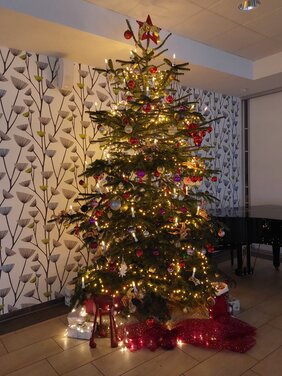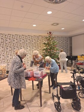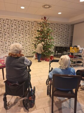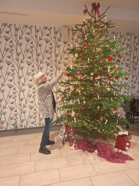 Eine lieb gewonnene Tradition für die Mieter*innen des Wilhelm Leuschner Seniorenzentrums sowie der Georg und Emma Poensgen-Stiftung ist das alljährliche gemeinsame Schmücken des Weihnachtsbaums im Saal.